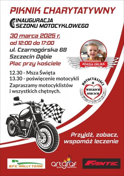 W niedzielę 30 marca, w naszej wspólnocie parafialnej odbył się piknik charytatywny na rzecz leczenia Adasia Orlika, który choruje na zanik mięśni. Pomimo niezbyt przychylnej aury nasi parafianie, mieszkańcy Dabia oraz motocykliści, którzy mieli inaugurację sezonu motocykowego nie zawiedli. Zostało zebrane nieco ponad 25 tys. zł. A już w sobotę 12 kwietnia rodzice Adasia, zapraszają wszystkich na piknik charytatywny, który odbędzie się na Jasnych Błoniach w Szczecinie w godz. 12.00 - 17.00.